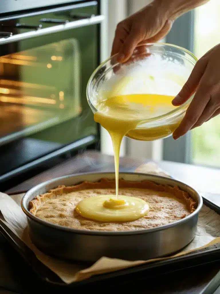 Bake for 18–20 minutes until the edges are lightly golden. The center should feel firm when you press it. Let it cool slightly while you make the filling—this helps prevent cracking.