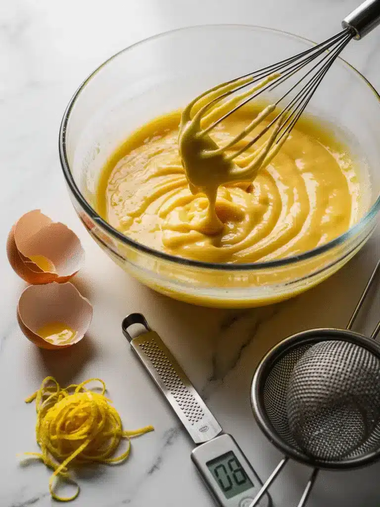 Whisk eggs and granulated sugar until blended. Add lemon juice, zest, and flour. Whisk until smooth and a bit frothy. Strain it through a sieve—trust me, it makes a difference.