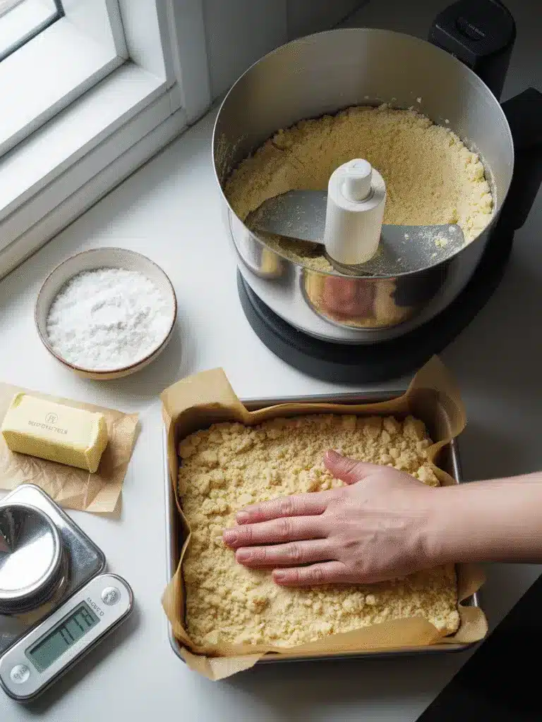 Line the 8×8-inch metal pan with parchment, leaving overhangs. Press the crumb mixture firmly and evenly into the pan. It should feel compact and solid, not loose. - Step 2: Pre-bake the crust