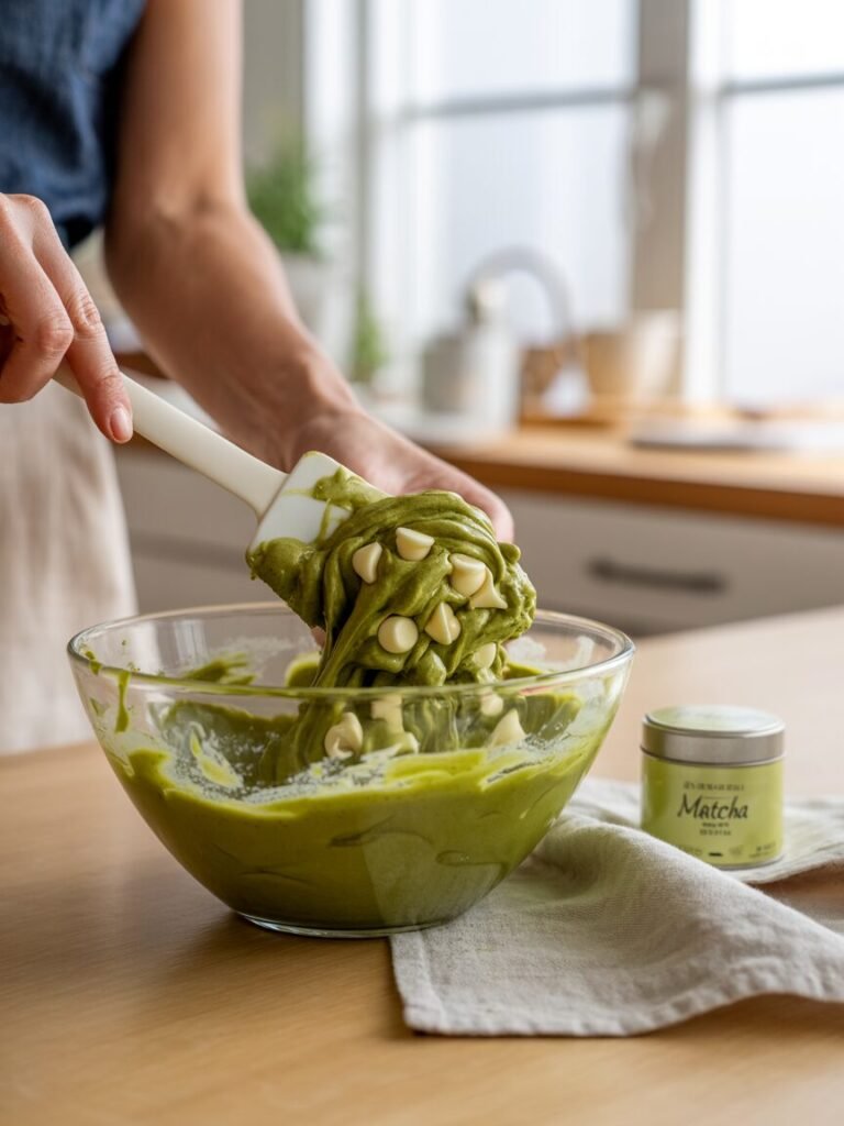 The science behind these cookies is simple: melted butter creates a tender crumb and helps the cookies spread just enough for a slightly chewy edge. Matcha’s flavor is best preserved when folded in at the last minute, so the color and freshness stay vibrant. A small amount of cornstarch softens the texture and prevents the cookies from becoming too dense. The white chocolate is added after the batter is mixed, so the chips stay distinct and not melty.