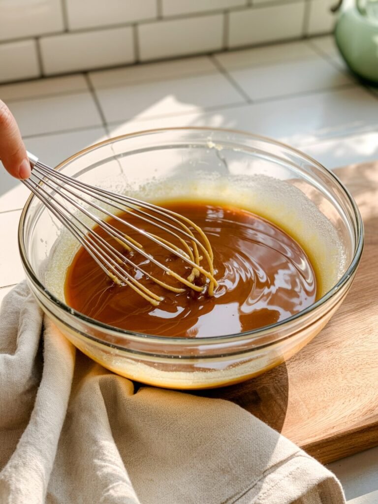 In a medium mixing bowl, whisk together the melted butter, brown sugar, and granulated sugar until the mixture looks glossy and smooth, about 30–45 seconds.