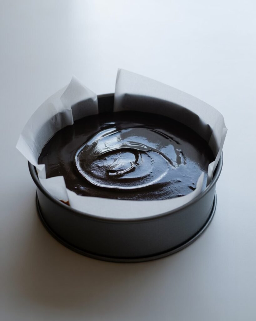 Finally, the batter is mixed gently and kept fairly thin—this ensures an even crumb instead of tunnels. The higher hydration combined with hot blooming water helps the cocoa dissolve fully, preventing chalkiness and boosting the cake’s signature midnight tone.