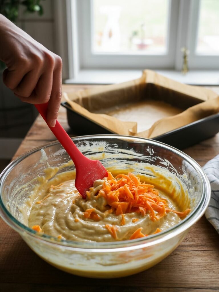 Visual cue: The batter should be thick but pourable, smooth with visible carrot and nut pieces. It should not be runny or ultra stiff; overmixing will make it elastic and heavy.