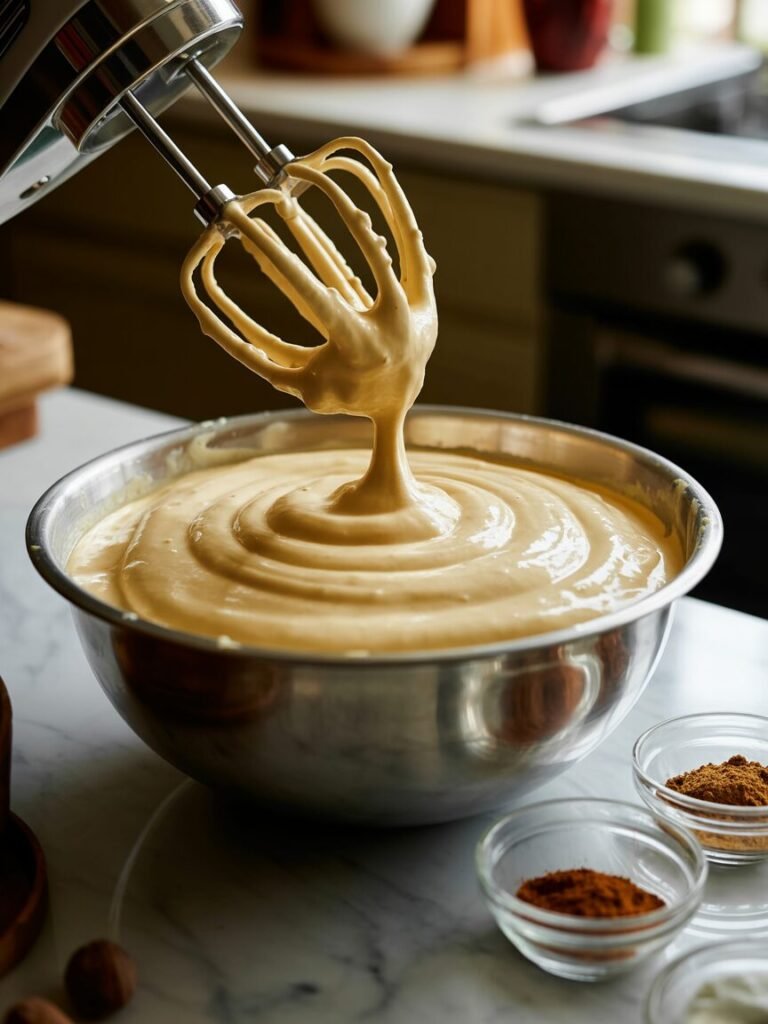 In a bowl, beat softened cream cheese until completely smooth—no visible lumps. Add powdered sugar, sour cream, vanilla, lemon juice, salt, and spices. Beat again until glossy and thick.