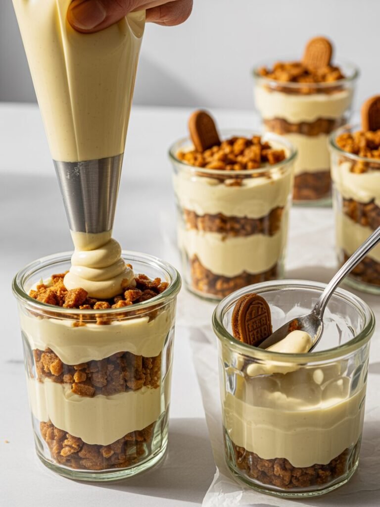 Serve these straight from the fridge for clean layers, or let them sit 10 minutes for a softer, creamier bite. They pair especially well with salted caramel sauce, a tart cranberry compote, or espresso because those flavors cut the richness. If you’re serving a crowd, set up a “parfait bar” with extra crumbs, candied ginger, and chocolate shavings so people can top their own.