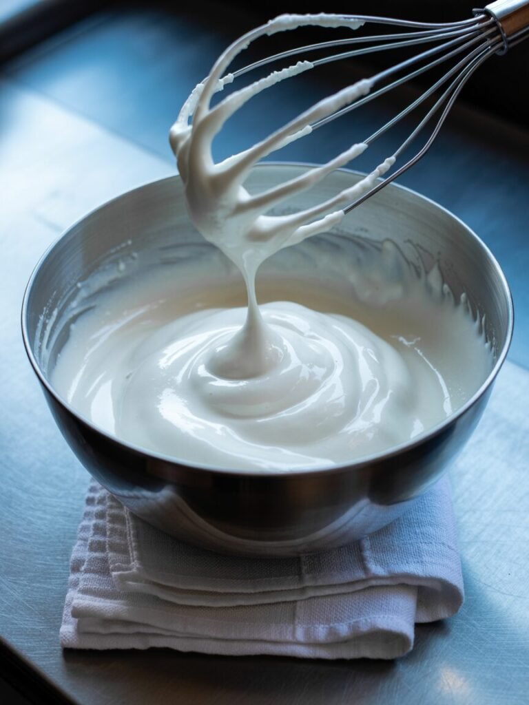 Checkpoint: lift the whisk—peaks stand, but the tip gently bends (“soft hook”).