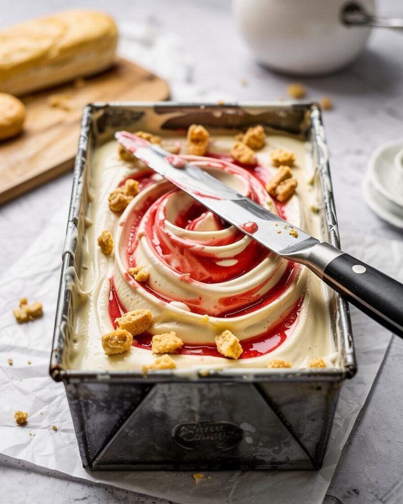 Pro tip: Cook the strawberry swirl until slightly jammy — reducing excess water is what keeps this ice cream creamy instead of icy.