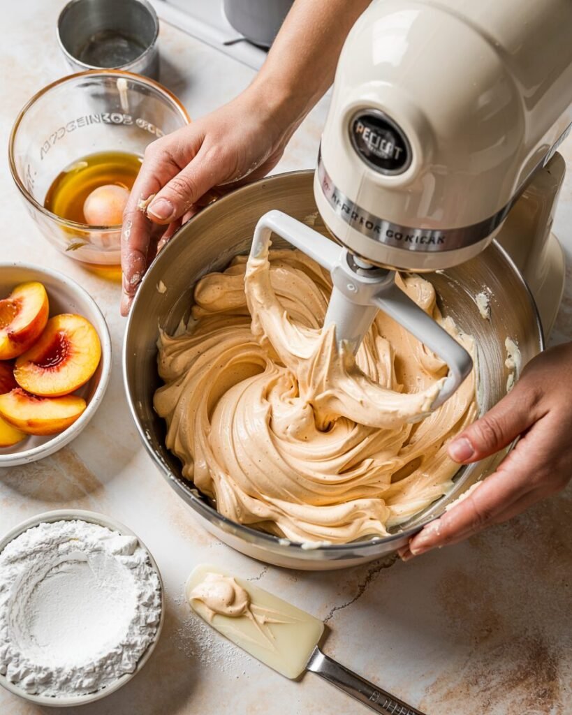 What makes this buttercream different is the simple peach reduction technique that concentrates the fruit’s natural sweetness before it’s blended into fluffy whipped butter. The result is a frosting that pipes beautifully, spreads easily, and adds a subtle peach flavor that pairs perfectly with vanilla cakes, cupcakes, and even sugar cookies.