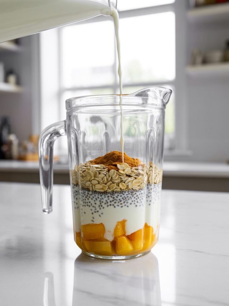 Step 3: Blend on high for 45–60 seconds, until smooth and creamy. If the mixture is too thick, add a splash more milk and blend again.