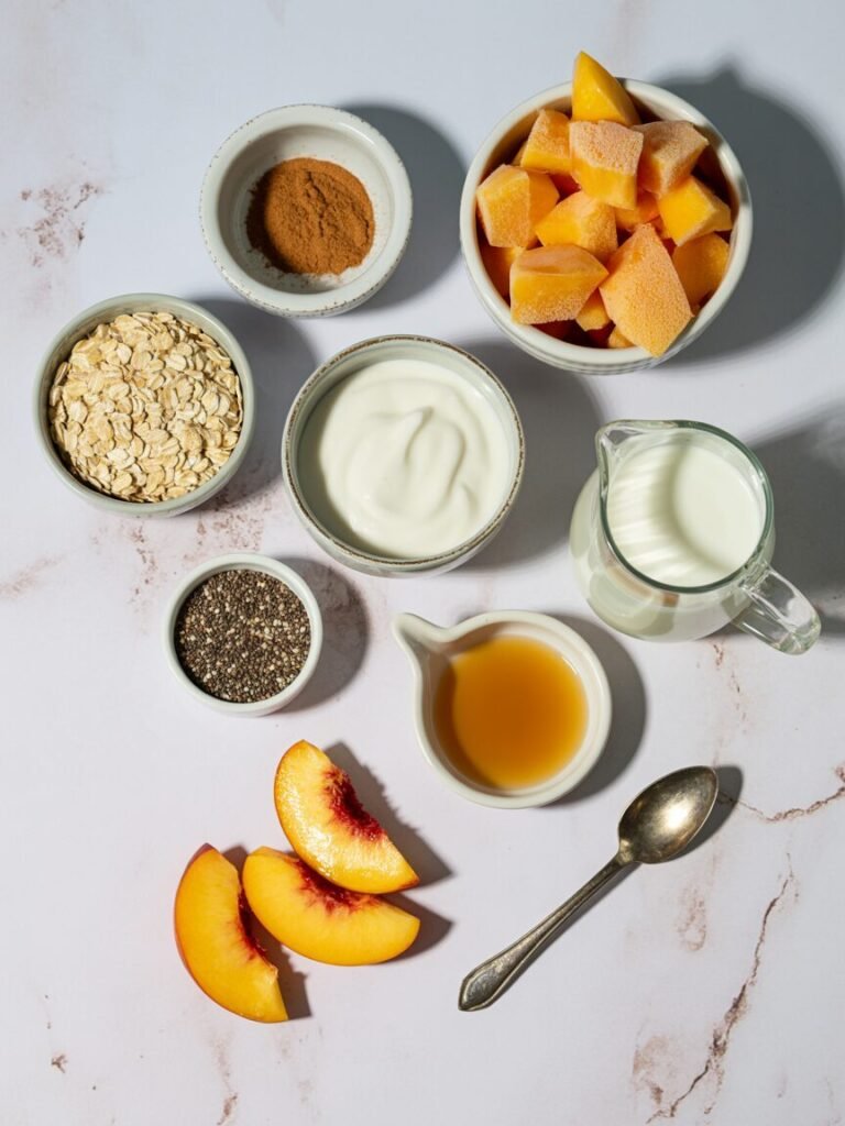 - Final: Soaked oats, frozen peaches, plant-based yogurt, and a touch of maple syrup. Smooth, creamy, and peach-forward.
