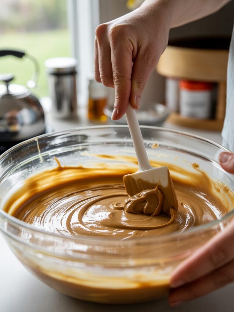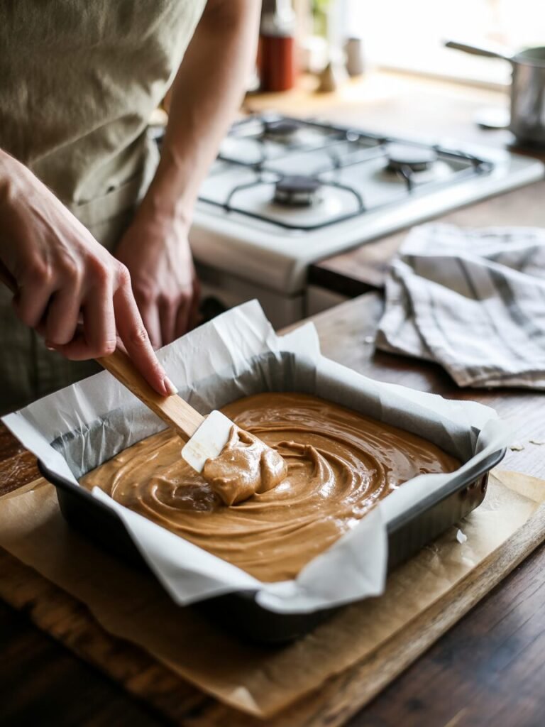 Visual cue:Â Batter should be thick and hold shape when pressed, not runny or oily. - Press into pan:Â Transfer the mixture to the prepared pan and use a spatula to spread evenly, smoothing the top using a spatula dipped in warm water for a polished finish.