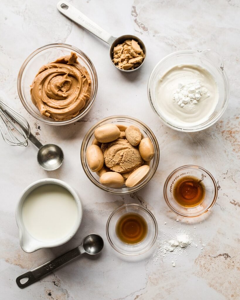 - Creamy peanut butter — 120 g (½ cup) — provides fat, flavor, and creamy texture