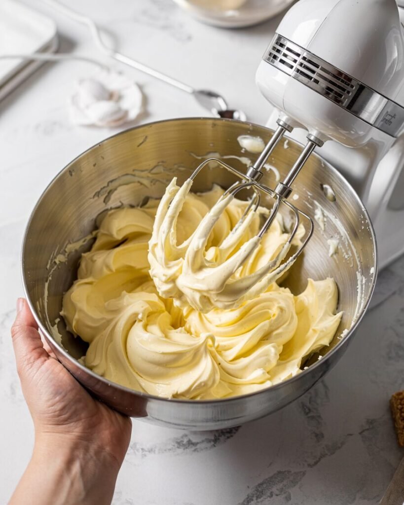 Finally, cream or milk loosens the texture. Adding liquid slowly creates the ideal spreadable consistency without breaking the emulsion.
