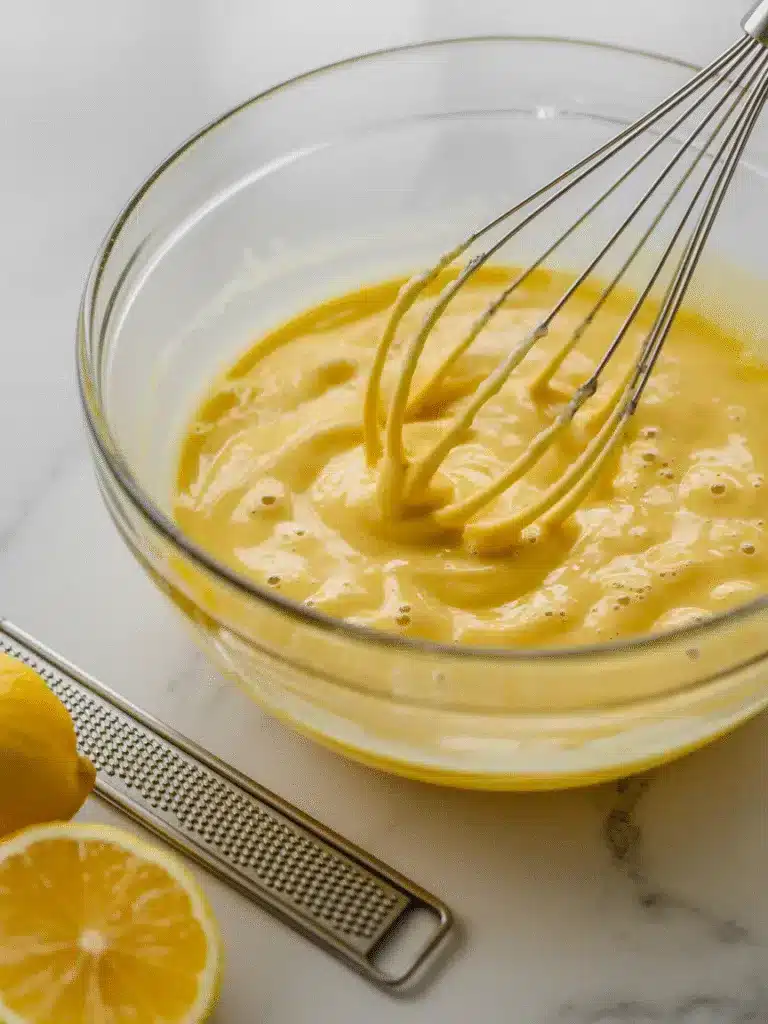 In a bowl, whisk egg yolks, oil, yogurt, vanilla, and lemon zest until emulsified — ~1 minute. Visual cue: Smooth, pale yellow, no separation.