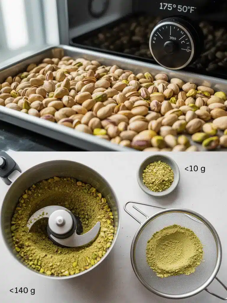 Finally, toasting the pistachios before grinding deepens flavor dramatically. Raw nuts taste flat; a quick 8-minute toast at 175∘C175∘C (350°F) brings out their natural sweetness and complexity.