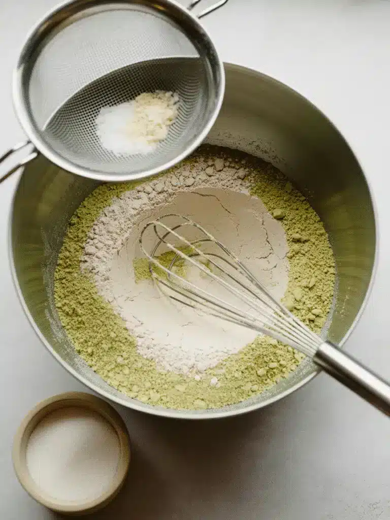 Sift pistachio flour, AP flour, baking powder, baking soda, salt. Whisk in sugar. Avoid clumps — they cause tunneling.