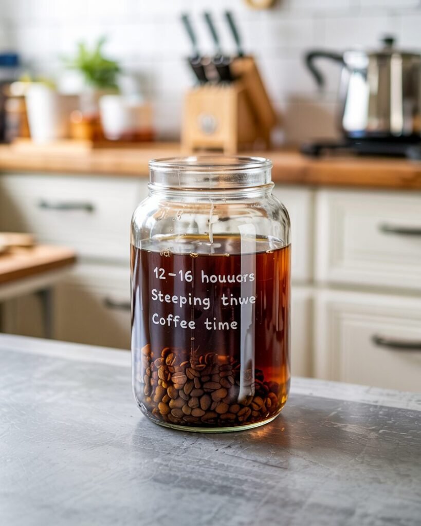 1. Combine 85g coarsely ground coffee and 680g cold water in a jar.
