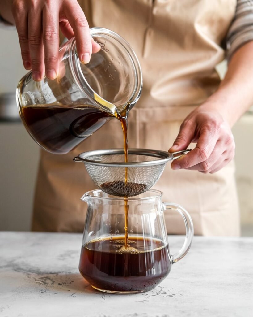 1. Pour coffee through a fine-mesh sieve or double layer of cheesecloth into a pitcher.