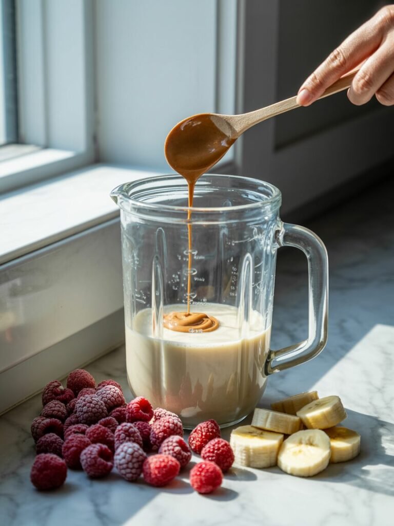If you’re using a weaker blender, the order in which you add ingredients matters. I always add liquid first, then softer ingredients, then frozen fruit and nut butter on top. That way the blades can move freely and blend everything smoothly instead of getting stuck.