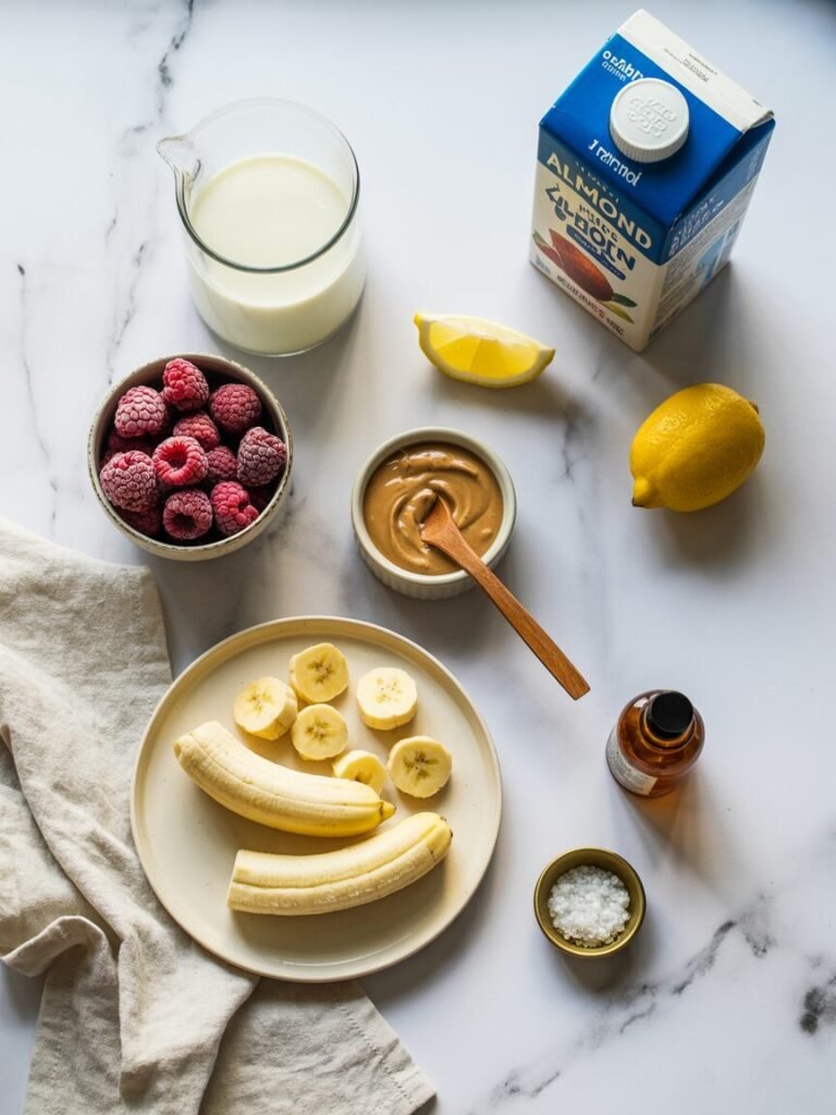 Frozen raspberries give thickness and a bright, tart edge. If using fresh, add 3–4 ice cubes and expect a thinner texture. - Unsweetened almond milk — 180 ml (¾ cup)