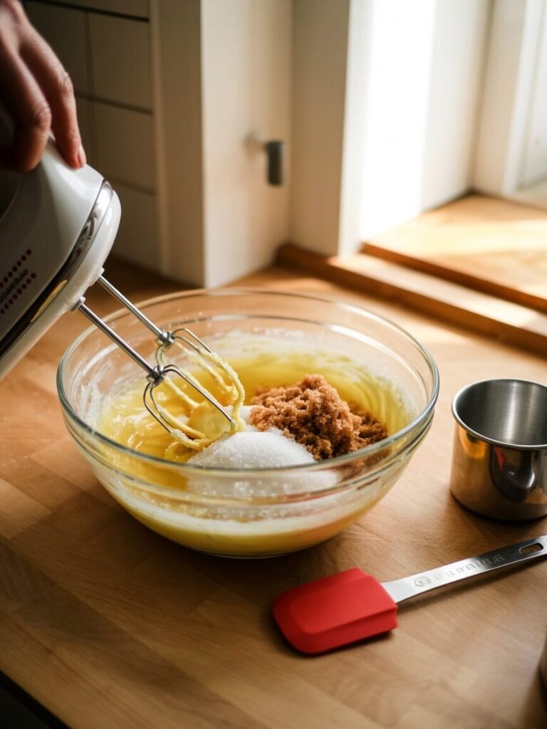 In a mixing bowl, cream 140g unsalted butter with 100g brown sugar and 65g granulated sugar on medium speed for 2-3 minutes until light, fluffy, and the sugar begins to dissolve. Visual cue: mixture should look pale and somewhat creamy, not grainy.