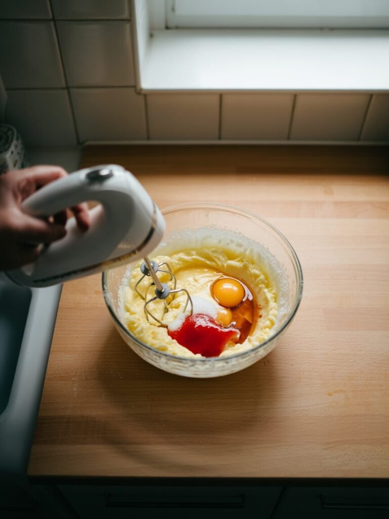 Add 1 large room-temp egg, 1 tsp vanilla extract, 1/2 tsp white vinegar, and 1 tbsp gel red food coloring. Mix on low speed until fully incorporated and the batter is uniformly red and glossy. Visual cue: batter should be smooth and rich red without streaks.