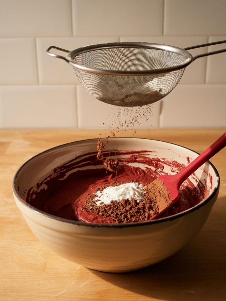 Sift together 225g all-purpose flour, 15g cocoa powder, 1/2 tsp baking soda, and 1/4 tsp salt. Gradually add to wet ingredients on low speed until just combined. Avoid overmixing. Visual cue: dough should be thick, slightly sticky, and deep red.