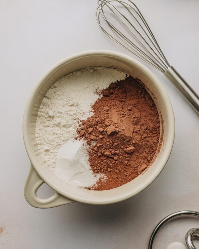 In a bowl, whisk together: flour, cocoa, salt, and baking soda.