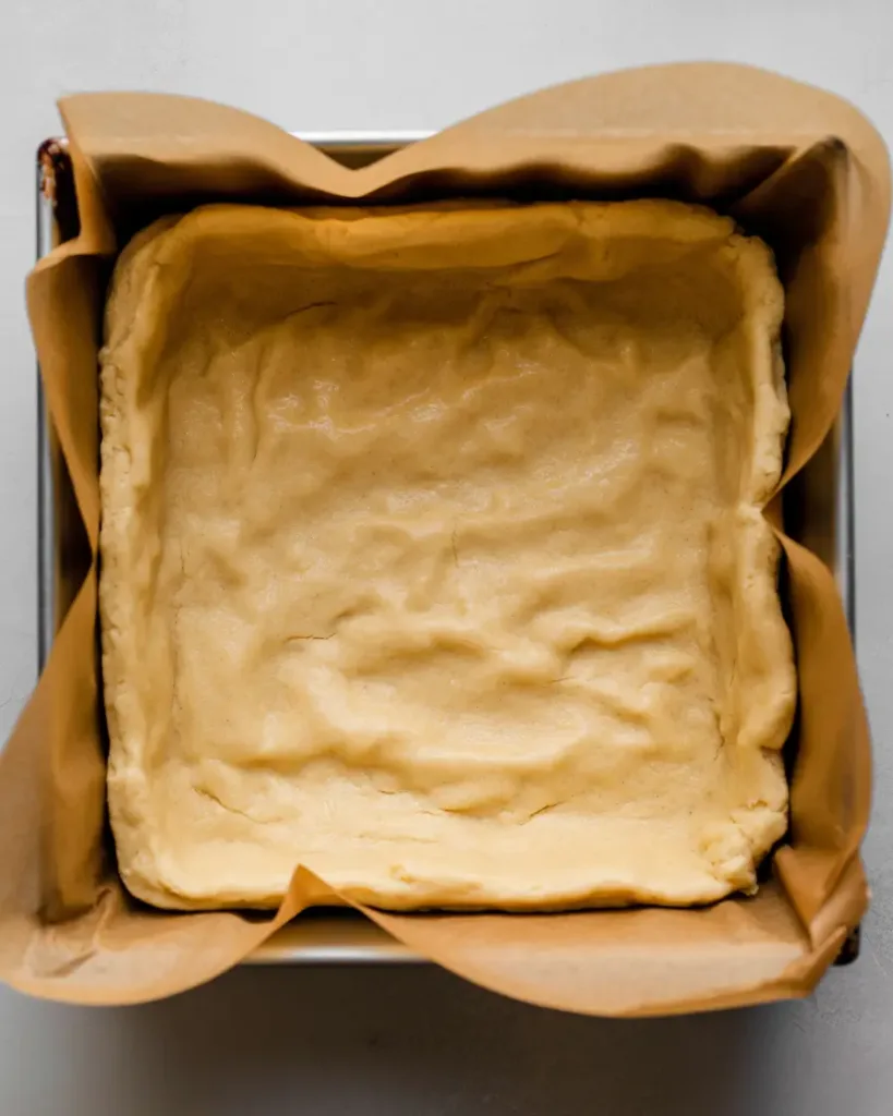 Preheat to 175°C (350°F), middle rack. Line 8-inch pan with parchment, leaving overhang for lifting bars later. - Make crust (10 minutes)