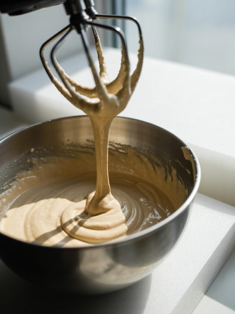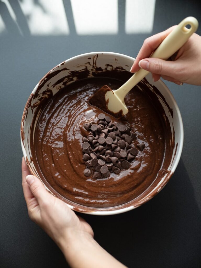Fold dry mix into the batter in two additions until just combined. Fold in 60–90 g chocolate chips. Batter should be thick, glossy, and slowly level—not runny or stiff like dough. - Rest