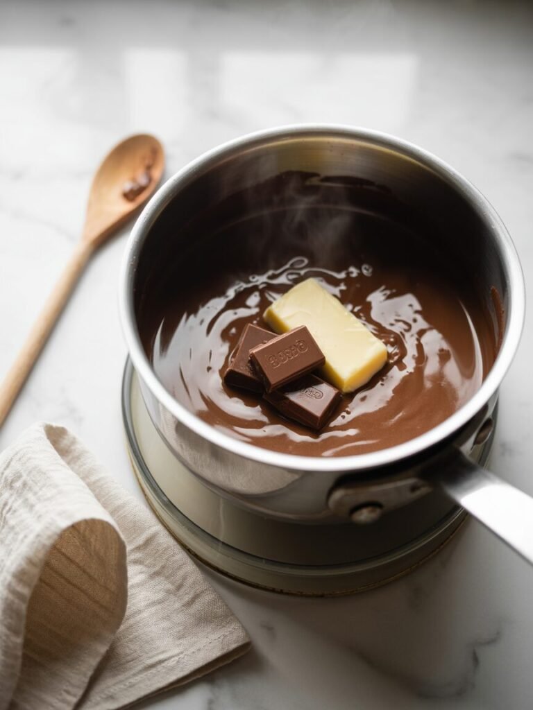 Melt chocolate and butter: Combine chocolate and butter in a heatproof bowl; set over barely simmering water and stir until smooth, 3–5 minutes; target 45–50°C (113–122°F) warm, not hot. Visual cue: glossy, fluid, no lumps.