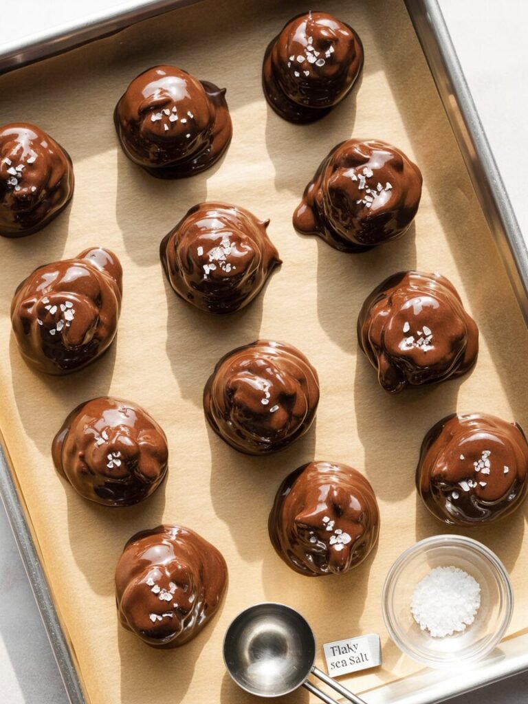 Scoop 1.5 tbsp mounds, 12 per sheet, spaced about 5 cm (2 in) apart. Lightly sprinkle each mound with flaky sea salt. - Bake