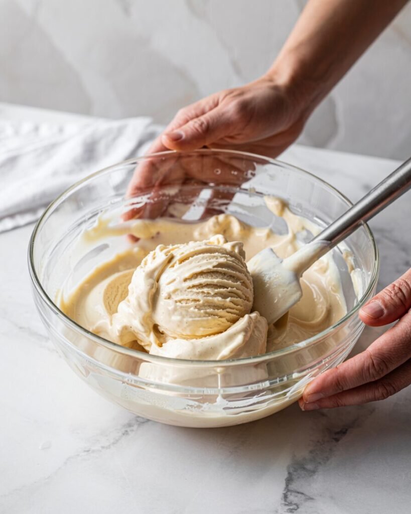 - Whipped cream structure traps air. Folding gently preserves that air, creating a light, scoopable base.