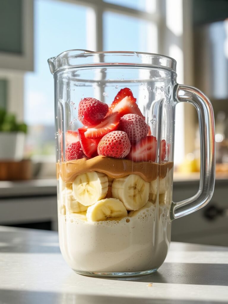 A great smoothie is about balancing water, sugar, fiber, and fat so it blends thick and stays mixed. Frozen strawberries act like tiny “ice crystals with flavor,” so they chill and thicken the drink without watering it down the way ice cubes do. Almond milk is mostly water, so we add a small amount of bodybuilders (banana and/or yogurt) to create that creamy texture and prevent quick separation.