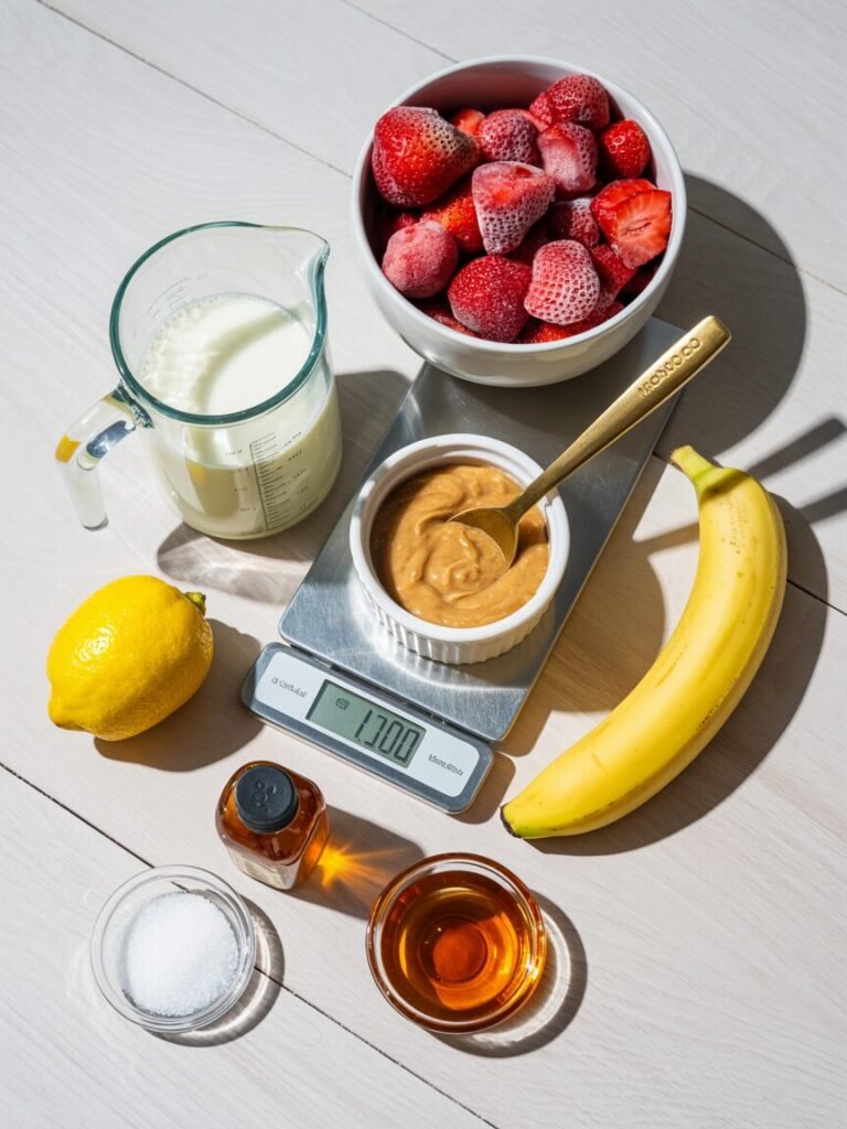 - Lemon juice — 5 g (1 tsp) — Brightens strawberry flavor (optional but recommended).