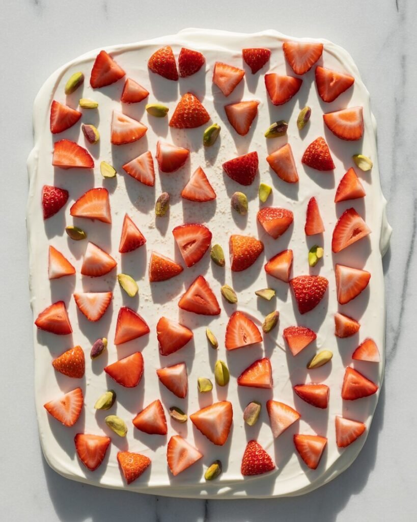 Scatter strawberries evenly. Press lightly so they adhere but don’t sink fully. Add optional toppings.