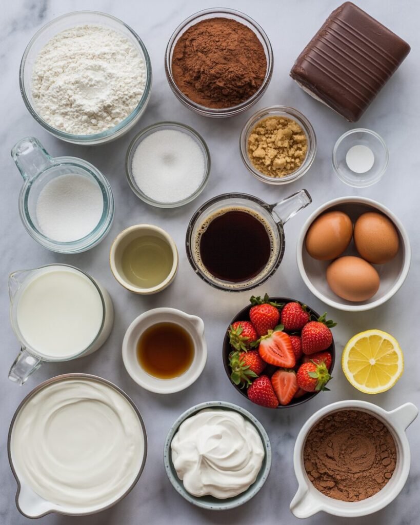 What really sets this recipe apart is how predictable the results are. You don’t need a stand mixer, professional tools, or a decade of baking experience — just a few smart techniques and clear visual cues. And if you’ve ever battled sinking layers, runny fruit fillings, or unstable whipped cream, don’t worry. This version was created after multiple test batches to remove the frustration and leave you with a cake that stacks neatly, slices cleanly, and tastes like a velvety chocolate-covered strawberry in every bite.
