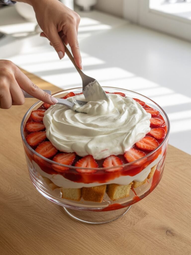 Repeat the layers: cake → strawberries → whipped cream until you reach near the top of the dish (usually 2–3 full sets of layers, depending on your dish).