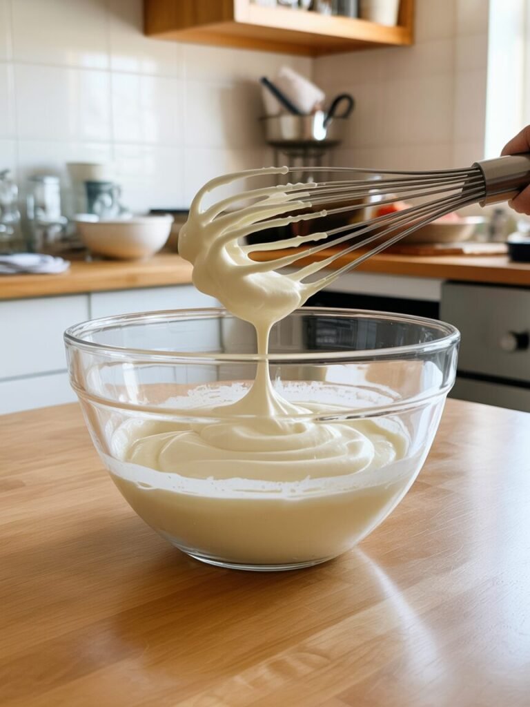 Visual cue: Cake should spring back softly when touched. Batter should be smooth and pourable, not lumpy.