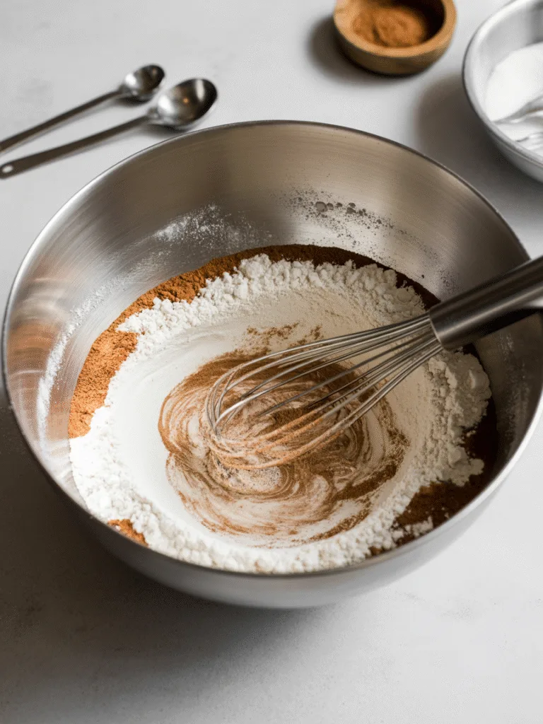 • Whisk dry ingredients: In another bowl, mix flour, spices, baking soda, and salt. Sift if you want to be extra clean, but honestly, a good whisk gets you 90% of the way.