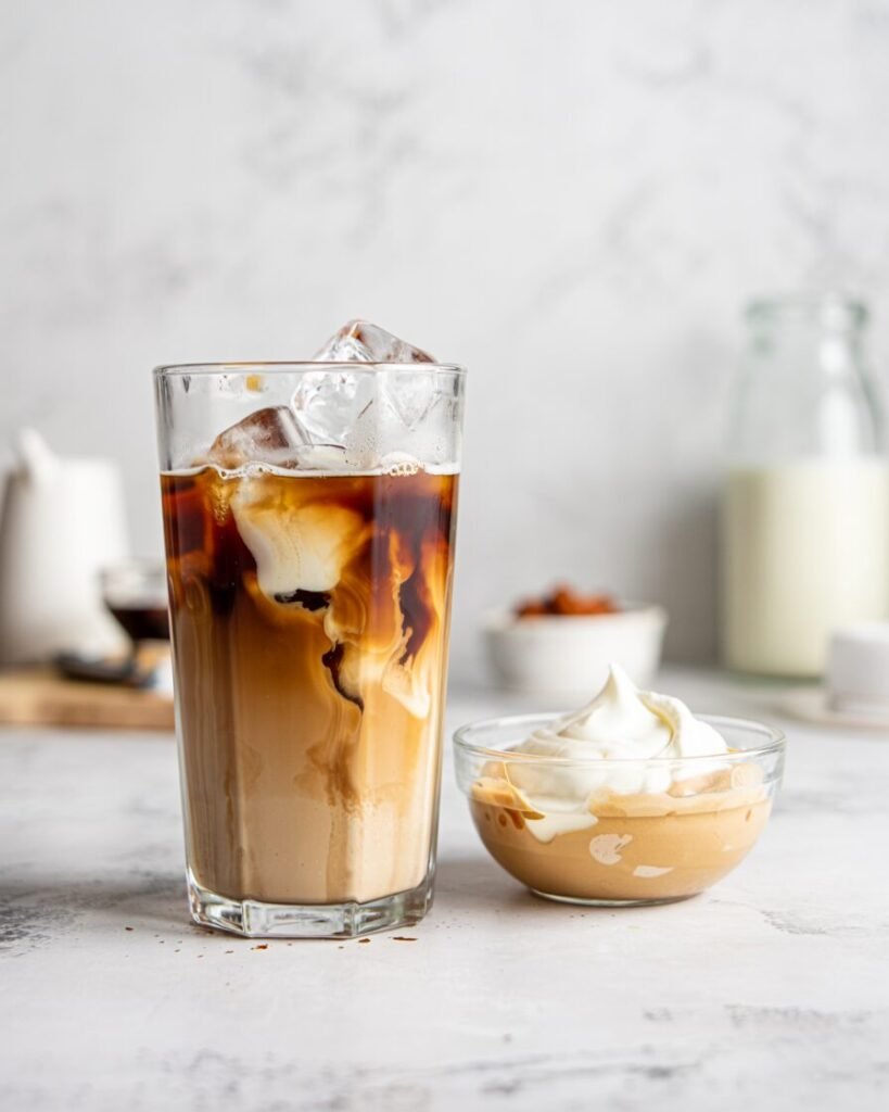 - How it should look: A thick, creamy layer floating on top of the dark coffee‑milk base, with ice visible at the sides.