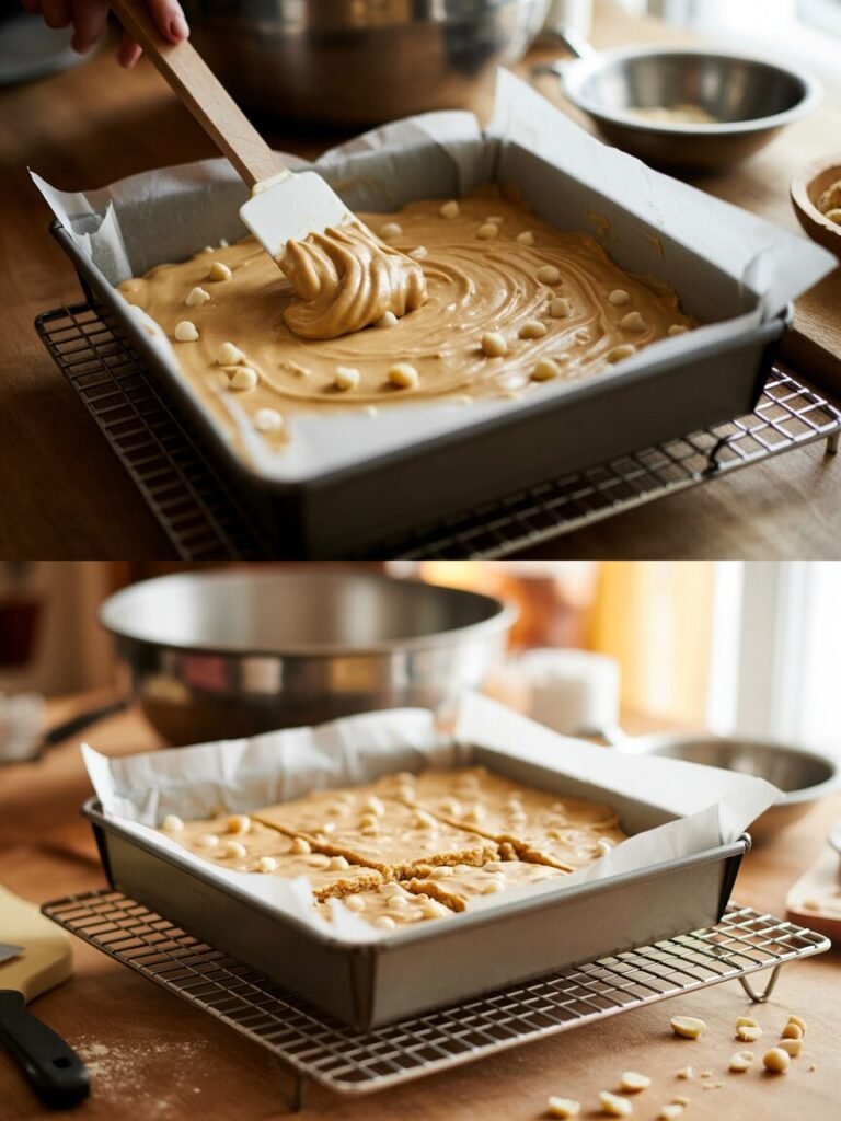- Spread batter into the pan. Bake 25–30 min until edges are golden and a toothpick comes out with moist crumbs (not wet batter). Cool completely before slicing.