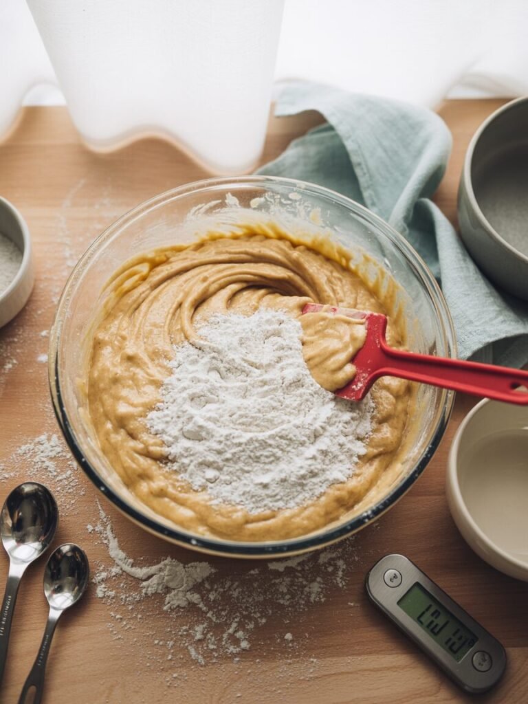 - Sift flour and salt over the wet ingredients. Gently fold in with a spatula until just combined. Don’t overmix. Visual cue: Batter should be thick and sticky, but no dry flour lumps.