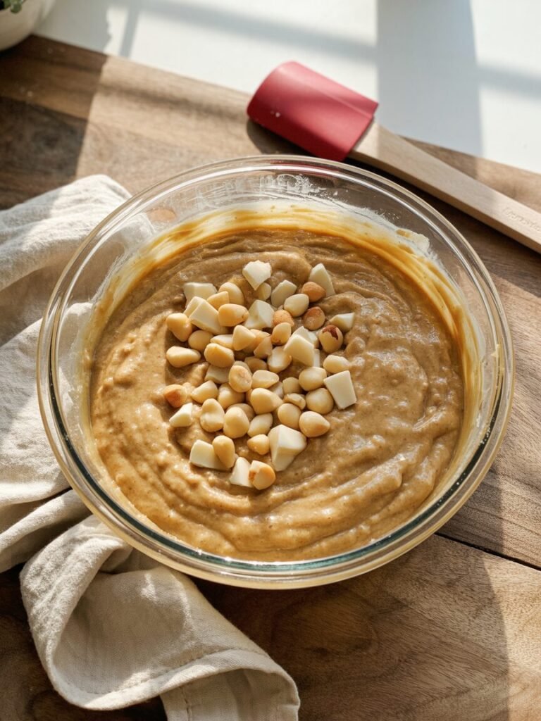 - Add chopped white chocolate and toasted macadamia nuts. Fold gently to distribute. Visual cue: Mix-ins should be evenly spaced, not streaky.