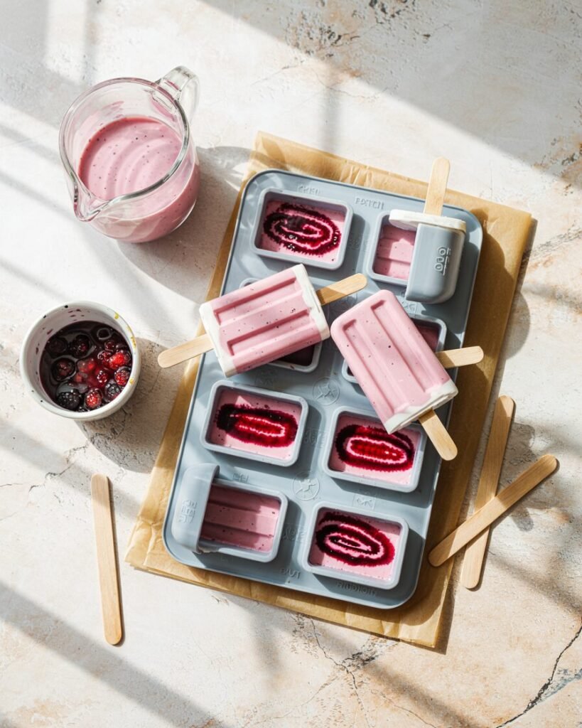Pro tip: Straining watery berries or using Greek yogurt prevents icy crystals and gives the popsicles a silky, scoop-like texture even straight from the freezer.