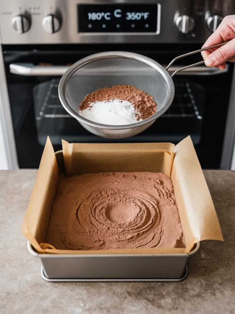 First, line your pan with parchment, making sure to leave about a 1-inch overhang on the long sides. Then, preheat your oven to 180°C (350°F) and place a rack in the middle; let it preheat for a good 20 minutes. While that’s happening, sift your flour, cocoa, baking powder, salt, and milk powder all together. You’re looking for no lumps in that dry mix.