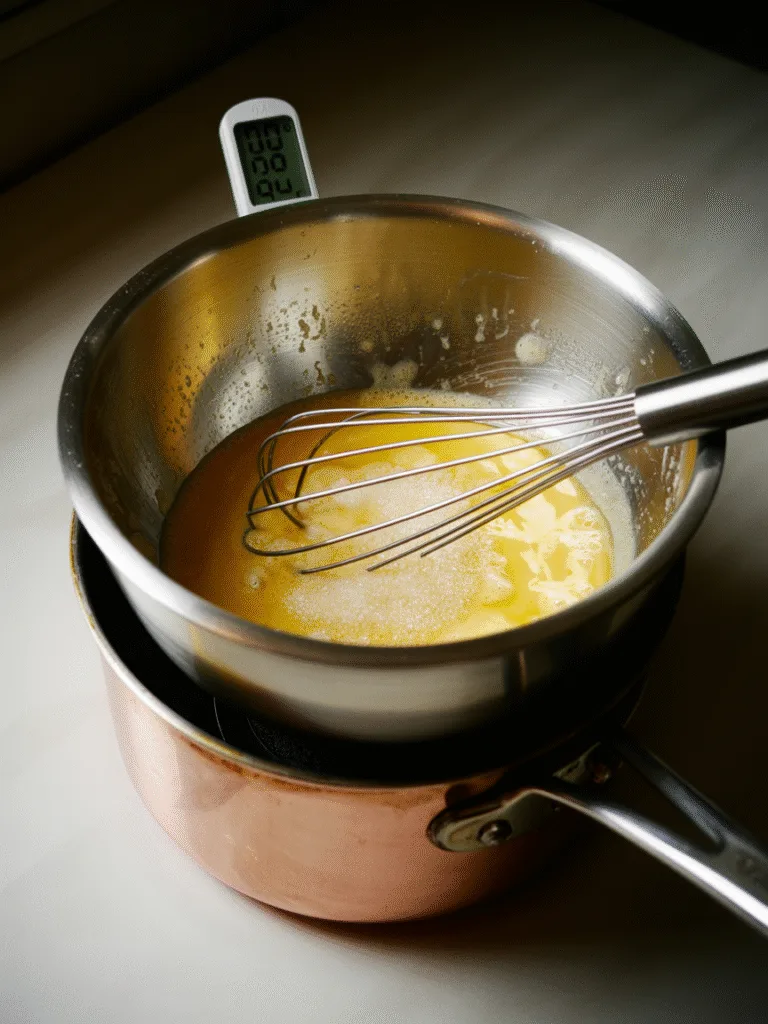 Grab your heatproof bowl and combine the eggs and sugar. Set that bowl over a saucepan with a bit of simmering water—think of it as a makeshift double boiler. Whisk it constantly until the mixture warms up to about 40°C (104°F) and you can’t feel any sugar granules when you rub a little between your fingers. Move it to a clean bowl, then whisk it by hand until it’s thick, pale, and, ideally, tripled in volume. This usually takes about 5–7 minutes of steady whisking. You’ll know it’s ready when the batter forms a ribbon that holds its shape for about 5 seconds when drizzled. Just try not to overbeat it, or it might end up a bit greasy.