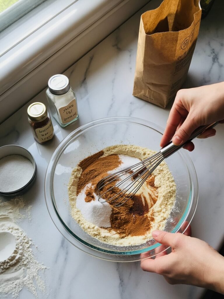- In a large bowl, whisk together flour, sugars, baking powder, baking soda, salt, and cinnamon.